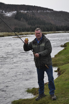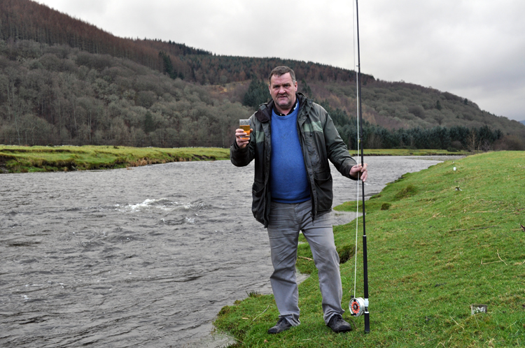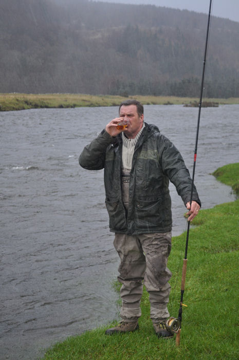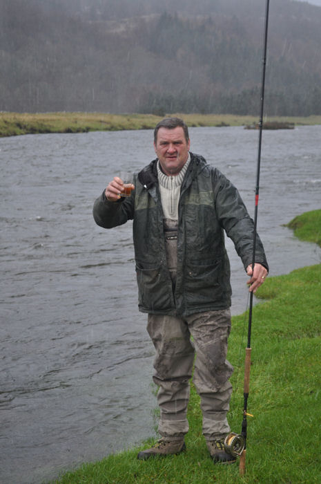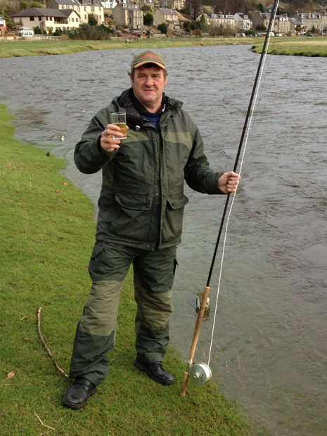To the Tweed, May your net be wet, and your line be tight. Thank You to Steve's son Alistair for the pictures. Don't you just love Steve's face when wasting good whiskey !!! |