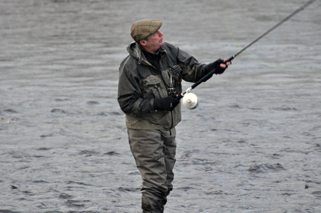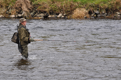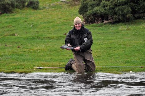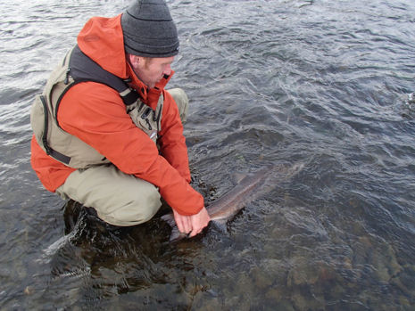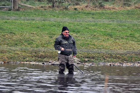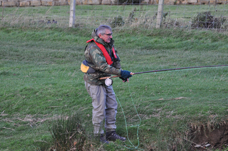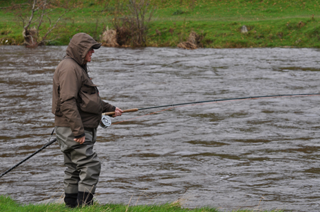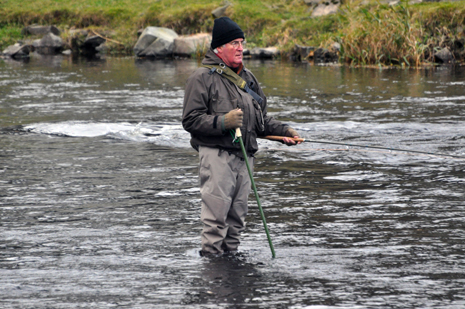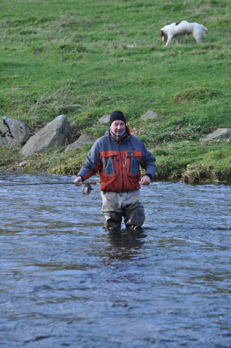 26th November 2012 AT LAST A FISH!!!Never has a fish, been so welcomed by a beat owner, and caught in weather you wouldn't put your bin out in!!! We had a very strong upstream wind to contend with and added to the mix, at times, heavy rain. Then this afternoon, the wind couldn't make its mind up which way it wanted to blow, which resulted in some interesting casts. To the fish, a 5lber for Paul L from The Bridge Pool, which he returned to "go and make babies". At last a fish! |