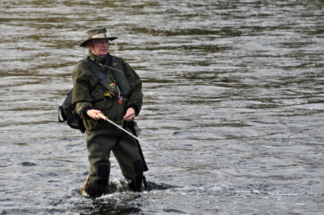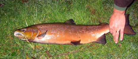 18th November 2011 ONE SEA-TROUT.One Sea-Trout today for Stan M, a 4lber from the Bridge Pool. I went up to the beat today to visit our team of rods and as I crossed the Tweed downstream of Galashiels my heart sank as I saw the river was a dirty chocolate colour, but I was reassured as I dropped down the hill from Clovenfords and saw the Upper Tweed was high but not dirty. Our team of rods were struggling with leaves fouling the hook, but were in good spirits. The river was continuing to rise and after lunch Stan landed his Sea-Trout but as time passed the river began to turn coloured and soon became un-fishable. We did however manage to view a pod of fish seek refuge from the dirty water and pull into the clean water flowing from the Walkerburn itself. Four of us stood and watched from no more than 6' away one of the wonders of nature. A large hen Salmon being courted by 5 or 6 cock Salmon and even some Sea-Trout joining them to see what was going on. To see such a thing, more than makes up for a poor days fishing. |