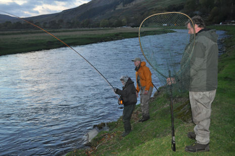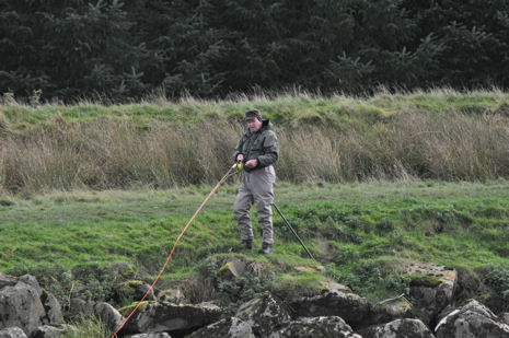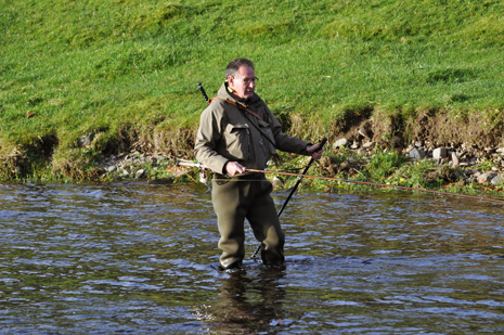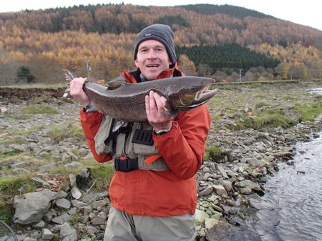 8th November 2102 TWO MORE.We welcomed a new group of rods today. Arnold S opened his account today with a 14 lber in The Bishops, he hooked his fish and it turned broadside to take advantage of the fast water, then took off like a missile down river, at one point he had 200 yards of backing out! Arnold had to follow it through the bottom part of Bishops, then he had to go through a gate,then through The Clure Pool and into The Gooselandale, after 30 minutes he managed to land it before it slipped over the weir into The Cauld Hole! Ray S, spending 6 days with us, added another fish to his tally, a 11 lber from The Bridge Pool in the very last shimmers of daylight. Shane M and Alfie R both lost fish today. |