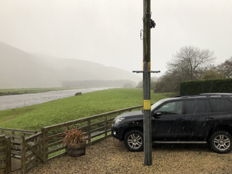 6th November 2021 Nothing Today...It all went a bit pear shaped after a quiet morning session. The brisk downstream wind changed to a fully blown hoolie, so strong it was lifting our anglers lines from the river. The wind brought the autumn curse, leaves!!! So many it was snowing leaves. The final nail in the coffin, torrential rain. Heavy enough for our anglers to call Steve on the radio for collection in the Mule, so they could retreat to the hut. The river is on the rise again. |