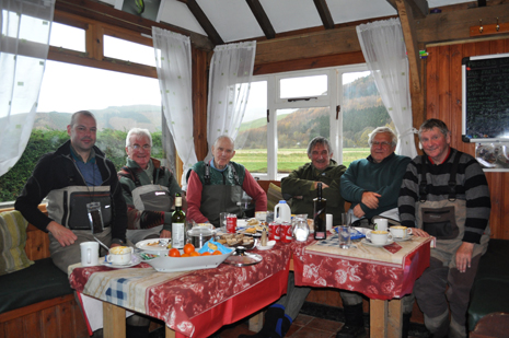 6th November 2012 TWO TODAY.Ray S got things underway today with a 5 lb Grilse from The Weaver. This fish was most welcome as it made up for yesterday, as he had a slight accident which resulted in a treble hook stuck in his hand and had to pay a visit to the local GP to have it removed. Nick E also scored today with a 14 lber from The Bridge Pool, Nick hooked his fish in last few slivers of daylight. Both fish returned. I was up on the beat today, visiting our team of rods after being overseas for 2 weeks. The lads are in very good spirits and are seeing a lot of fish, the banter and leg pulling around the table in the Bothy this evening was very enjoyable, no doubt helped along with a little 'whiskey alchemy' going on and great to hear and see glasses raised in a toast to Ray and Nick on their success today. |